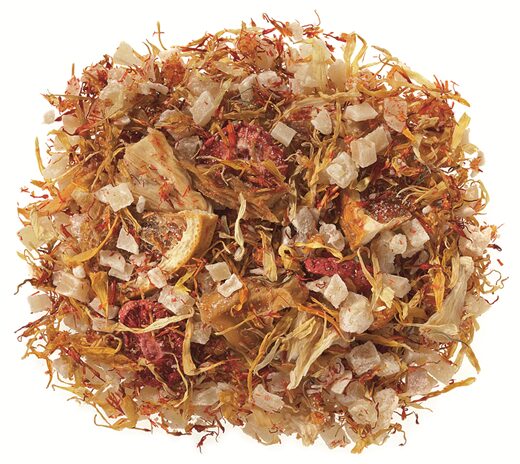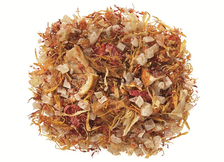 Skład: ananas i mango (kandyzowane oraz suszone), mandarynka liofilizowana, pomarańcza suszona, szafran, kwiaty nagietka, truskawka liofilizowana.